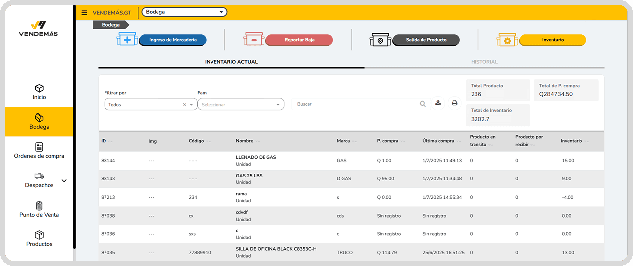 Controla tu inventario en todas las sucursales, ajusta stock, registra compras y recibe alertas cuando falte mercadería.